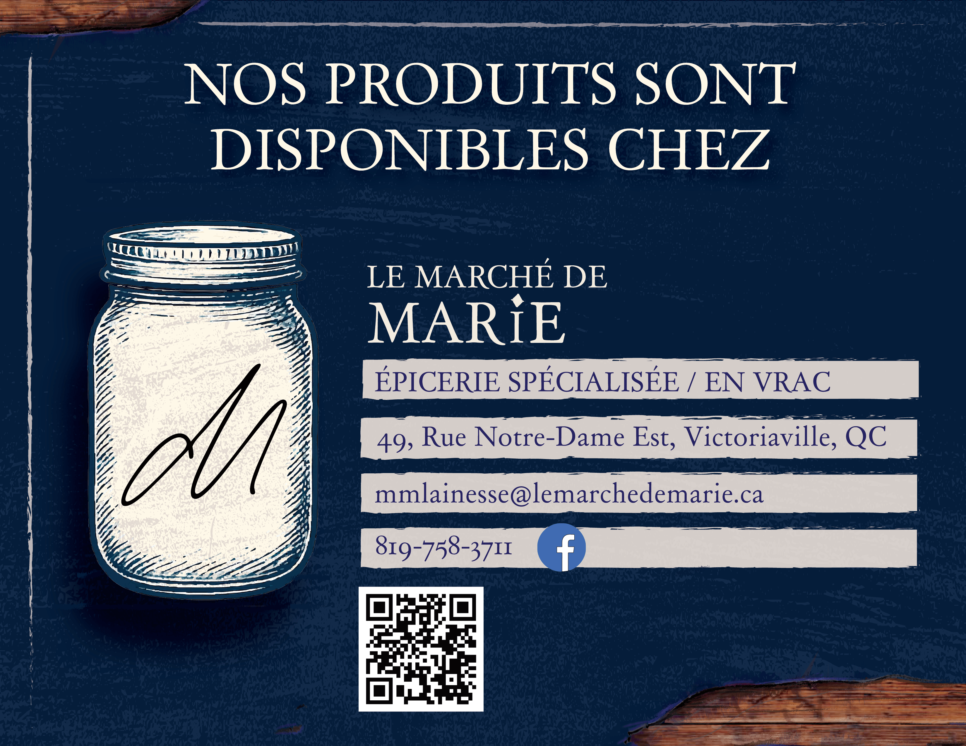 ENGLISH : Le Marché de Marie is a neighborhood grocery store specializing in local and bulk products. It also stands out for its unique service of selling and renting cake molds. The owner, Marie-Michelle, entrusted me with the task of revitalizing the brand’s image, to modernize its visual identity while preserving the warm, rustic charm characteristic of this type of charismatic small business. I was therefore responsible for the design of various visual assets (business cards, in-store signage, reference labels), as well as the creation of custom decorative * elements, including a tablecloth, in order to ensure overall visual coherence.